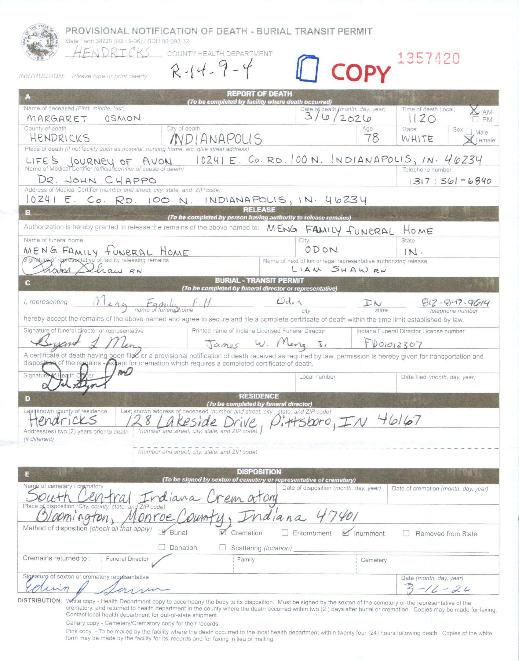 Arrangements and care have been entrusted to Meng Family Funeral Home in Odon.
